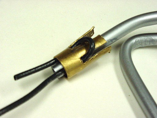 This 20:1 scale model of the actuator (Fig. 10) shows how the Muscle Wire (black) is fed through a gap, around a contact finger, (gold) and then back through another gap. First slide the contact onto the end of the "T" bar, (silver) then feed the Muscle Wire as shown above. Hold the contact in place and then pull the end of the Muscle Wire to close the loop. Bend the Muscle Wire at a right angle parallel with the long arm of the "T". Position the contact near to the end of the "T" bar and solder it in place. Trim the free end so that it does not interfere with the loco steps. Do not expect the solder to actually stick to the Muscle Wire as it is not solderable. This is strictly a friction attachment.
