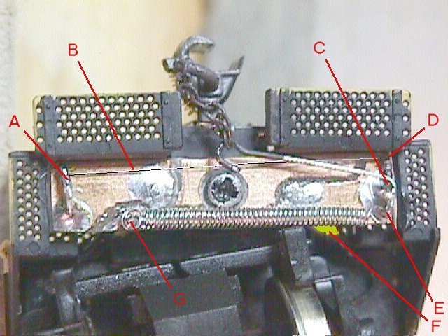 At the right side about 1/16" in from the end and centered vertically is a pivot point. (Fig. 4-C) It is a wire soldered into the PC board and sticking straight up from the board. At the left side is an anchor point. (Fig 4-A) It is a wire soldered into a hole at the lower left corner of the PC board and bent over parallel to the board surface and sticking forward (up) towards the end of the engine. It may be bent from side to side to adjust the tension on the Muscle Wire. About 1/8"-1/4" closer to the center of the loco, but also on the lower left side is a second anchor point. This is for the return spring, and just sticks up like the pivot does, but shorter. (Fig. 4-G)