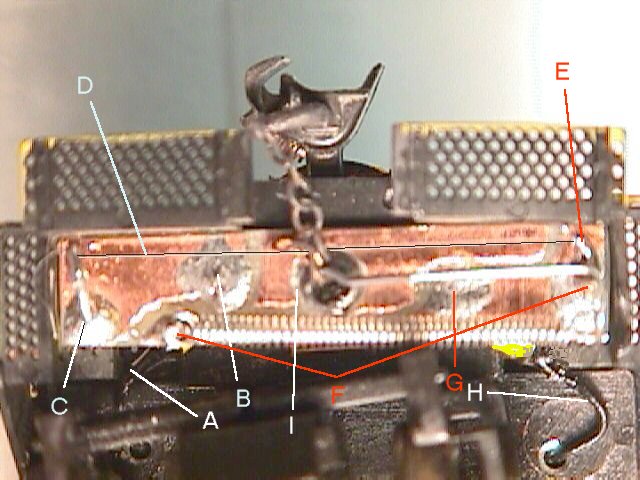 Power from the current limiter feeds into the actuator at the slip-on connector (Fig 6-H) made from a machined IC socket removed from it's plastic moulding. This socket is insulated with a bit of shrink tubing and slips onto a piece of wire soldered to the bottom (engine side) of the actuator board at Fig 6-G. From there power flows both to the pivot and the spring anchor point. (Fig 6-F) From these two points power travels through the "T" bar itself to one end of the muscle wire. (Fig 6-E) From there it flows through the wire, (Fig 6-D) heating it to over 70 degrees C in the process. The current continues via the fixed anchor point (Fig 6-C) to the second slip on connector (Fig 6-B) and then via a jumper wire (Fig 6-A) to the other end of the engine. After passing through the second actuator it connects to the DCC function control power lead.