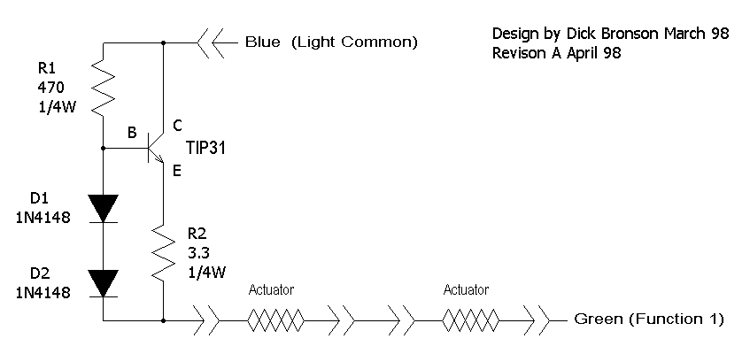 Next lets tackle R1. The gain (amount of amplification) in the transistor is only guarenteed to be 10 or more. That means that we need to have at least 1/10 of our load current or 18 ma going through R1 and to the transistor base. Again we know "E" and "I" and need to discover "R". Working on the "N" setting of DCC we can still expect about 10V. After removing the 1.2 volts of the two diodes we have 8.8 volts remaining. That gives us 8.8/.018=488, the closest standard value is 470 ohms. To figure the power in R2 the formula is I*E=W or .6 * .18 = .108W (about 1/10W) For R1 the formula is E*E/R=W or 10*10/470=.213 or just a little under 1/4W. We could use a smaller wattage resistor for R2, but R1 needs to be at least 1/4W.