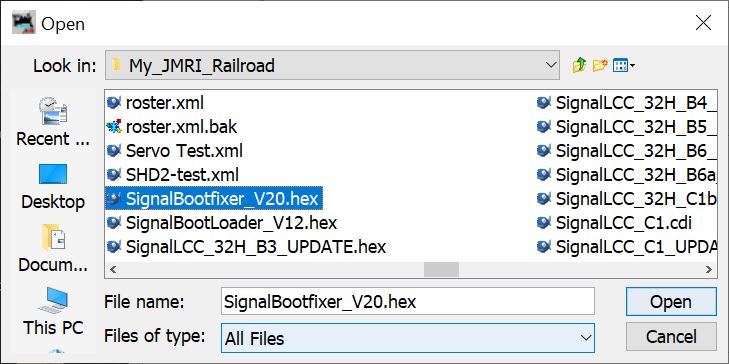 - From the file menu, select: 'SignalLCC_C7c_UPDATE.hex' (or the