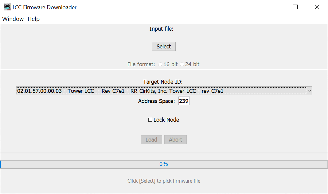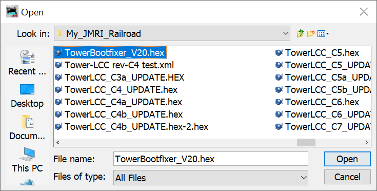 - From the file menu, select: 'TowerLCC_C7e1_UPDATE.hex' (or the